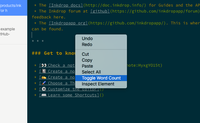 This adds a "Toggle Word Count" menu option to the menu that pops up when you right-click in an Inkdrop text editor pane.