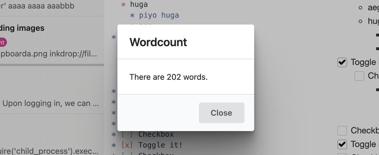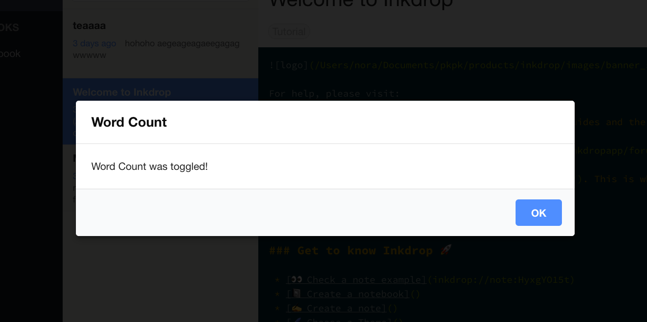 7. Inkdrop executes the plugin command wordcount:toggle which reveals the hidden modal message dialog