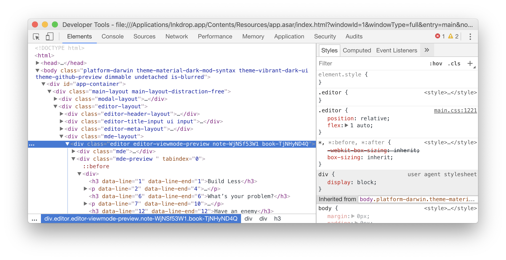 Developer Tools shows up. Find a div element with "editor" class as following: