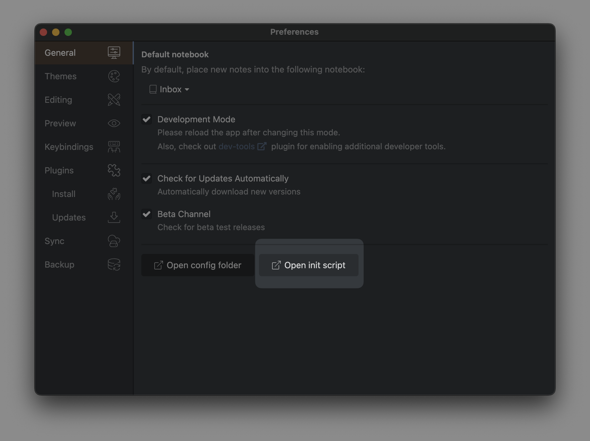 To quickly open the init.js file, click Open init script button from the Preferences window.